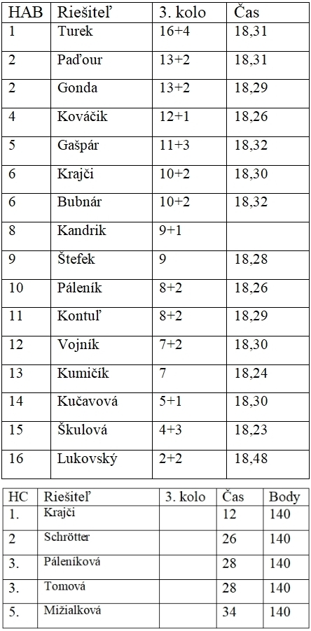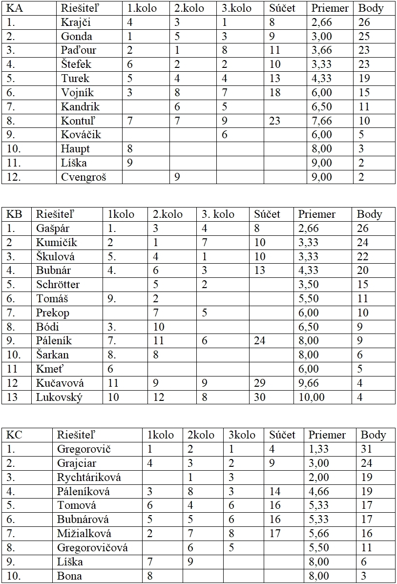 Trojkolová súťaž je za nami a výsledky sú všetkým záujemcom k dispozícii. Snažil som sa vyhodnotiť riešenia čo najobjektívnejšie, ale možno sa niekomu nebude tak javiť. V krížovkách som zoradil riešiteľov podľa bodov, ktoré som stanovil tak, ako sú na živých turnajoch udeľované body v kategórii A. Takže každý riešiteľ získal za umiestnenie od prvého po desiate miesto body 11-9-8-7-6-5-4-3-2.1. Považoval som to za najlepšie kritérium. Tak sa hodnotí i umiestnenie v GP, kedy má riešiteľ s dvoma dobrými umiestneniami šancu predbehnúť riešiteľa, ktorý rieši tri kolá. V prípade rovnosti bodov rozhodovalo lepšie umiestnenie: napr. umiestnenia 1 – 3 malo prednosť pred 2 – 2, čo v bodoch znamená 11+8 je viac ako 9+9.