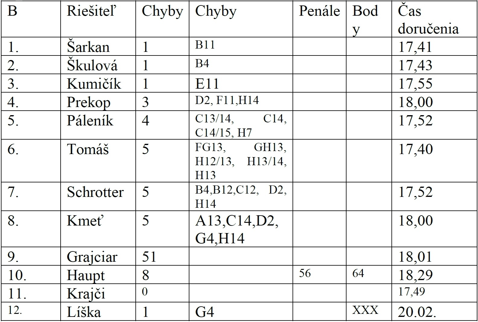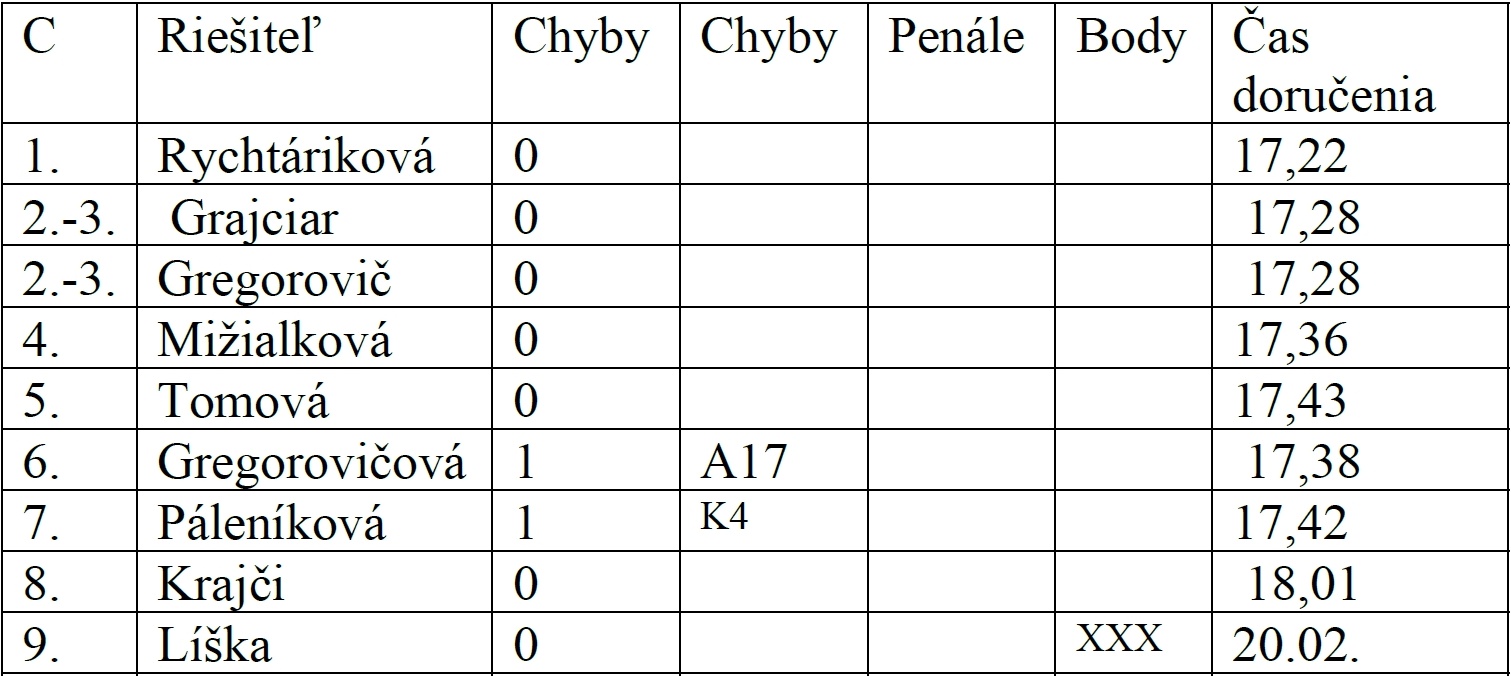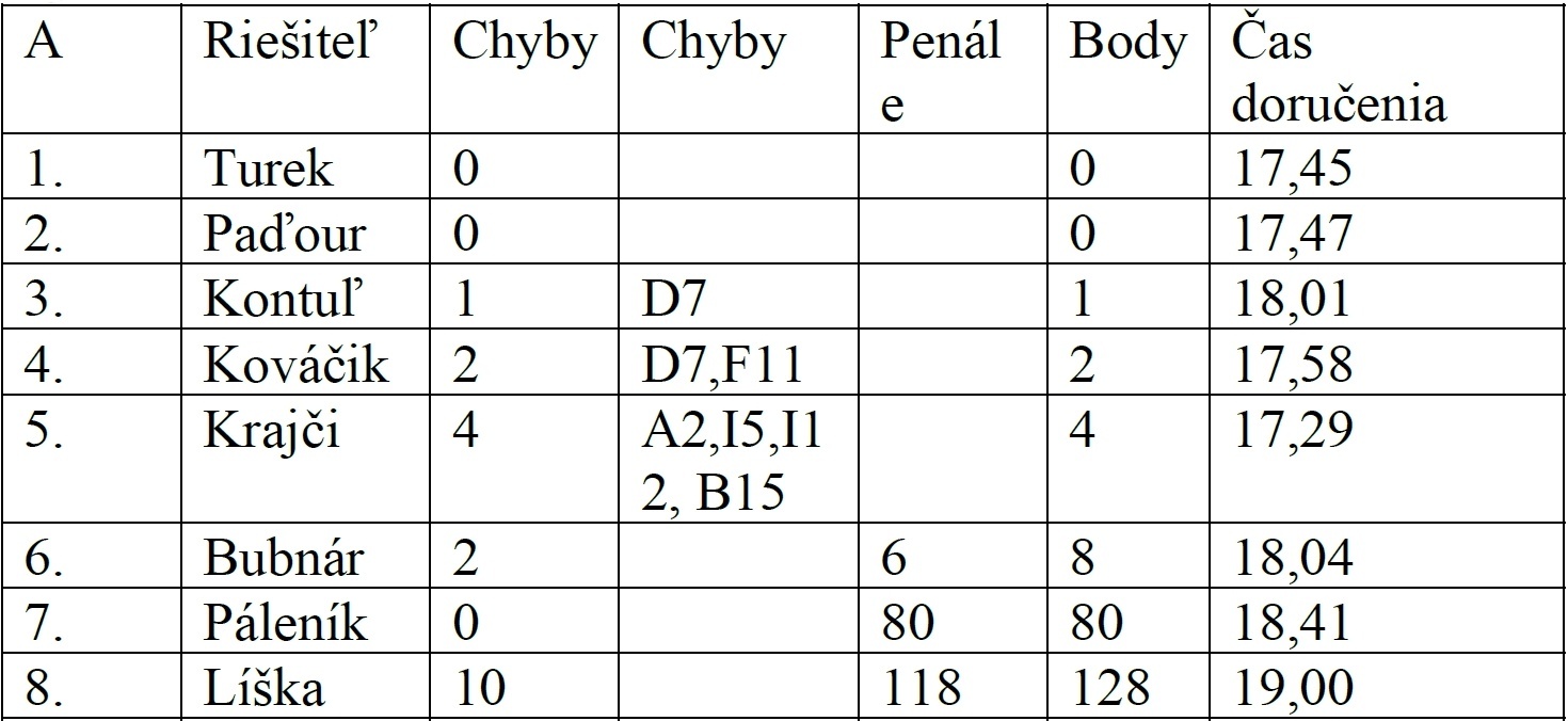 Predkladám definitívne výsledky online súťaže. Prebor v Prostějove vyradil zo súťaže priateľov spoza rieky Moravy, tak druhé kolo by sa malo uskutočniť 19. marca, kedy v Čechách žiadny prebor nie je. Jozefovia by mali oslavy pripravovať pred a po súťaži. Navrhujem čas 16,00 na krížovky a 17,30 na vyplňovačku. Vyplňovačka bude na spôsob predsilvestrovskej logickej úlohy riešenej kategóriou C, ale bude pre všetkých. Hádanky nebudú. Ak máte záujem o skorší čas, dajte vedieť, nie je to definitívne. Priateľ Kumičík čestne upozornil, že ctenú pani spisovateľku nazval Bryndzovou, čo som ešte pred štúdiom jej diela začiatkom roka považoval za správne a hľadal som české slová ako brynda, bryndáček a podobne na križovanie do slabikovky. Tým sa posúva na tretie miesto a víťazom v kategórii B sa stáva priateľ Šarkan. Vo výsledkovej listine sú uvedení všetci, ktorí riešenie poslali. Na prezenčnom turnaji sa môžu objaviť vo výsledkoch len v jednej kategórii, ale v podstate ma teší Vaša ochota riešiť krížovky, ktoré sa neoplatí uverejňovať pre hŕstku riešiteľov v časopisoch. Obťažnosť v kategórii C mi nevyšla, asi sú riešitelia príliš dobrí.